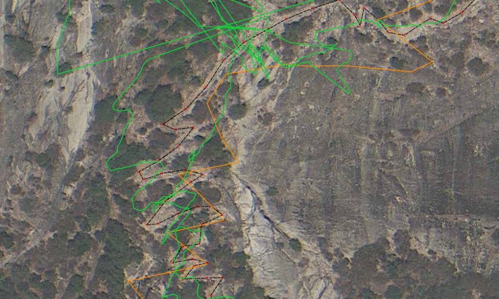 The green lines are my GPS lines going up and coming down. The orange line is the data that I got from the park service. The background is imagery from Google. Lastly, the black dashed line is my attempt to make things as accurate as I can.