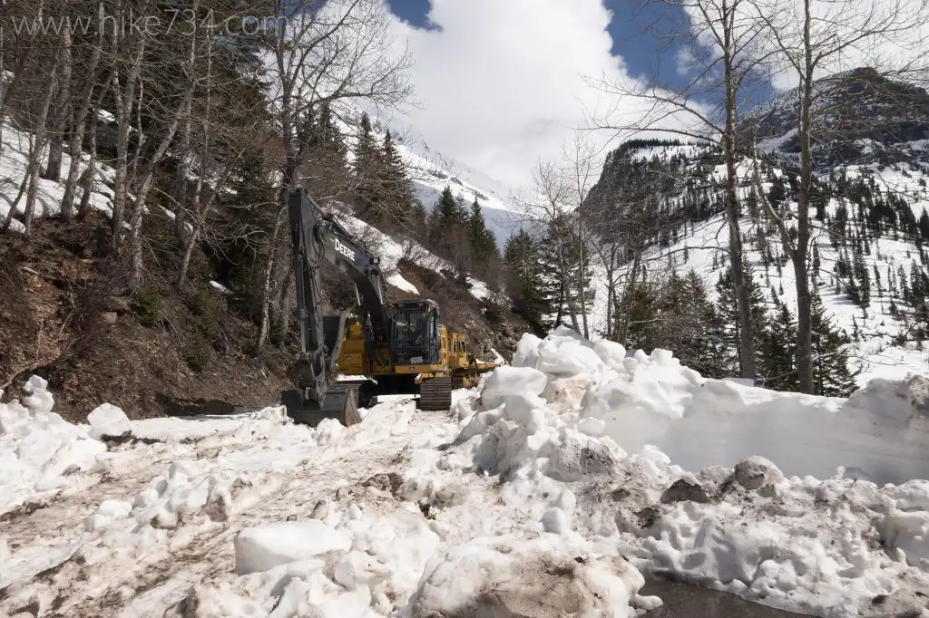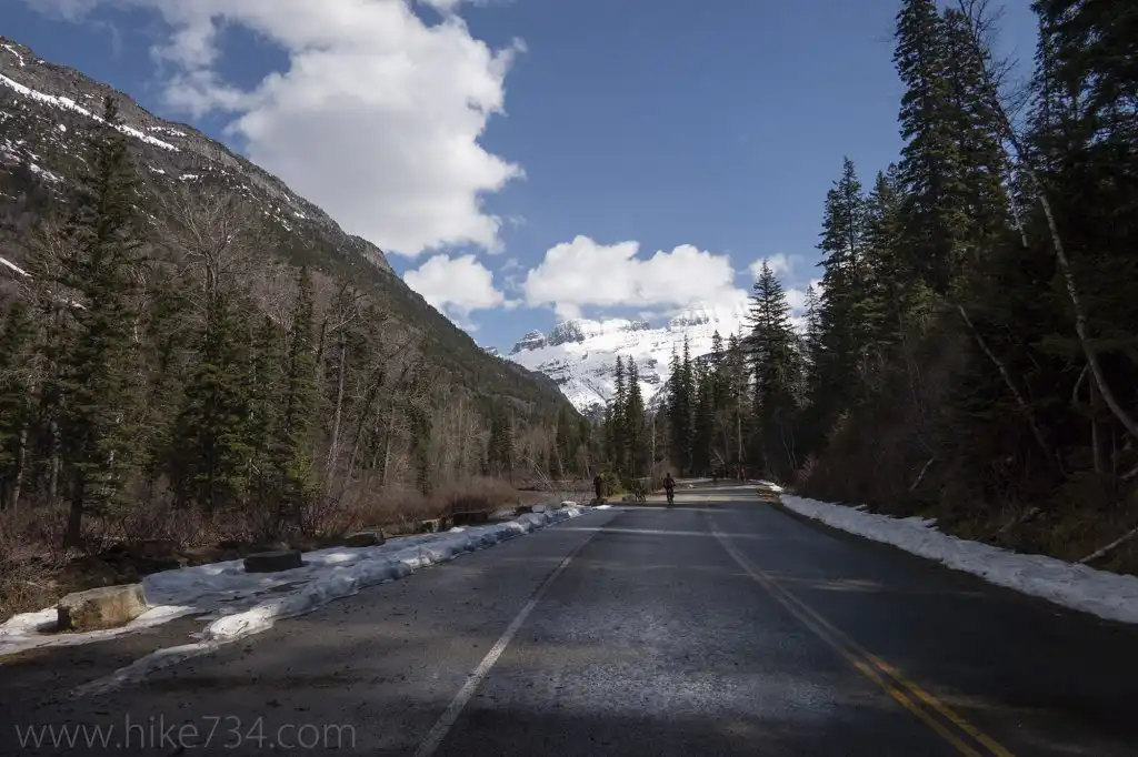 On the west side of Glacier, the Going-to-the-Sun Road is closed to vehicles at Lake McDonald Lodge. On the weekends and evenings, when the plow crews aren’t working, you can bike up to where they’ve stopped plowing.