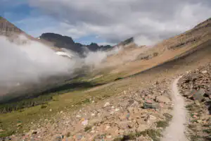Eventually we made it to the meadows with fading flowers and passed the trail that heads up to Siyeh Pass. The clouds shrouding Piegan Mountain were gradually breaking up revealing the mountain and the glacier of the same name perched on top.