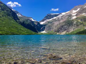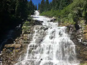 I made sure to keep my eye out for moose as the trail paralleled the St. Mary River. We made a brief stop at Mirror Pond which offers beautiful, unobstructed views of the mountains. No moose sightings here either, but I did spot several toads. Once we reached the junction for the Florence Falls Trail we decided to hike the spur trail to Florence Falls before continuing on to Gunsight Lake. The trail takes you right up to a ledge in front of the water as it cascades over broad, terraced rocks. This waterfall is gorgeous and definitely worth the side trip!