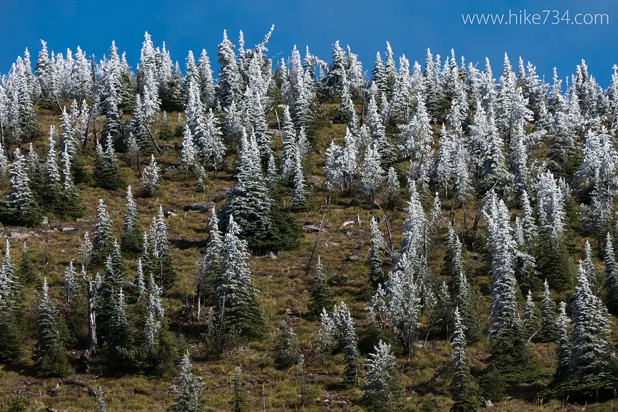 Diane I met and met up at Glacier National Park’s biologist offices and drove up to Lake McDonald. We started heading up to a spot below the lookout on a very promising day. The sky was beautiful and the larch trees were turning their breathtaking gold making the rather humble, wooded Snyder Ridge into something noteworthy.