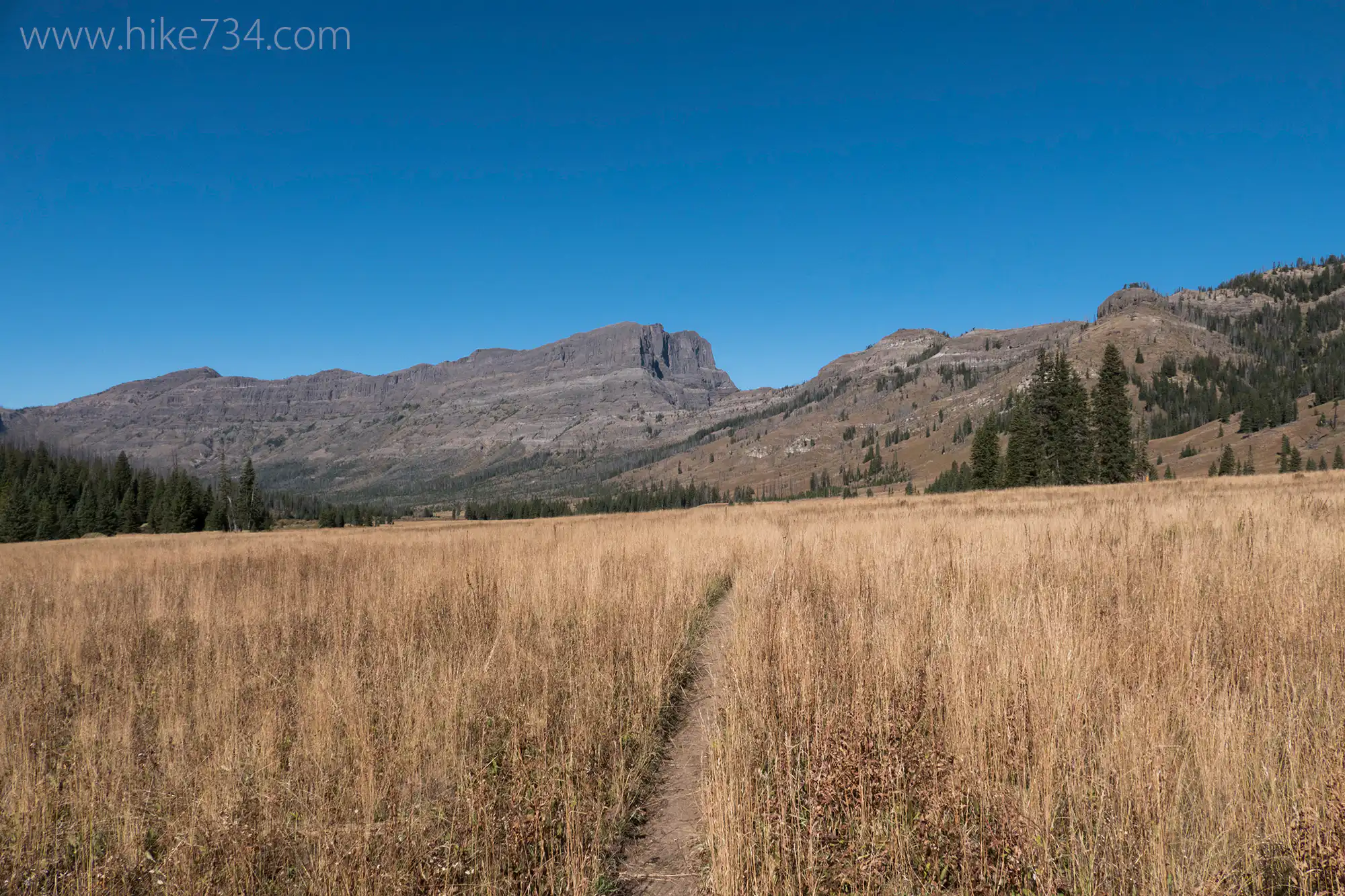 I emerged from the trees to see this vast, mountain meadow. I was able to cross Pebble Creek by hopping on rocks, but earlier in the year, it would be a ford. Once I got across, all I could say was, “Wow!” This broad, grassy meadow was fantastically beautiful. The back side of Barronnette Peak and Mt. Hornaday created a dramatic backdrop. Pebble Creek was lined with willows and the surrounding hillsides were covered with vegetation amongst a stand of gray trees from a former burn. The habitat up there begged for wildlife.