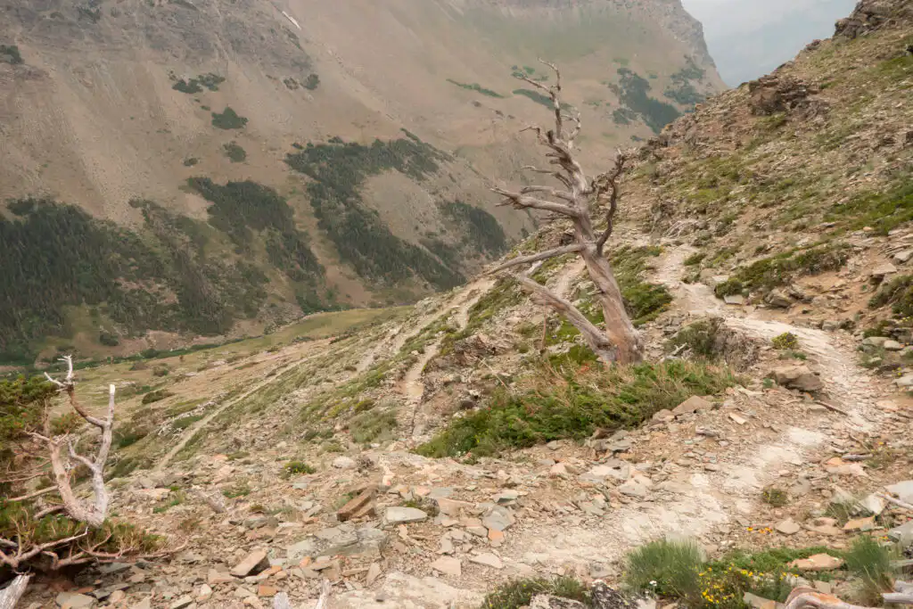 The trail alternates between the open, low growing vegetation, Whitebark Pine stands and stands of Subalpine Fir as it switchbacks up the mountainside. Two Medicine Lake becomes visible as Rising Wolf Mountain towers above it.