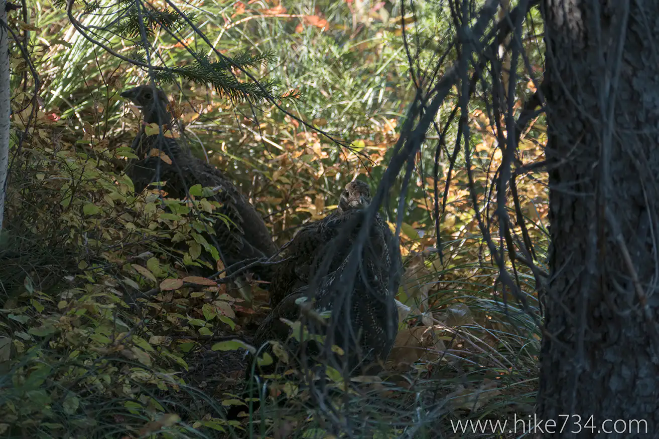 After driving up to the Loop on Going-to-the-Sun Road, we began the morning hike up to Granite Park Chalet and, eventually, Swiftcurrent Pass. On the way up we spotted a Red-tailed Hawk with breakfast in his claws. Further up the trail, a rustle in the bushes alerted us to a Dusky Grouse with three chicks.