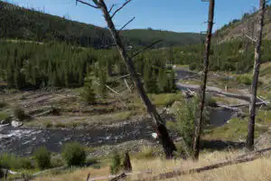 The Tower Creek trail in Yellowstone National Park is a trail that starts at the Tower Fall campground and follows the creek upstream for 3.5 miles. This trail appears on current maps, but is no longer maintained, so expect to ford the creek and employ some route-finding skills as you bounce between forests and meadows.