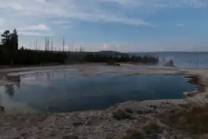 I started walking the boardwalk of West Thumb Geyser Basin in the evening which I think is one of the two best times to hike these busy areas (the other being early morning.) I was blown away first thing by the stunning backdrop of the West Thumb of Yellowstone Lake. All of these geysers are smattered about the landscape with the lake fully in view and a figure-eight boardwalk weaving around them.
