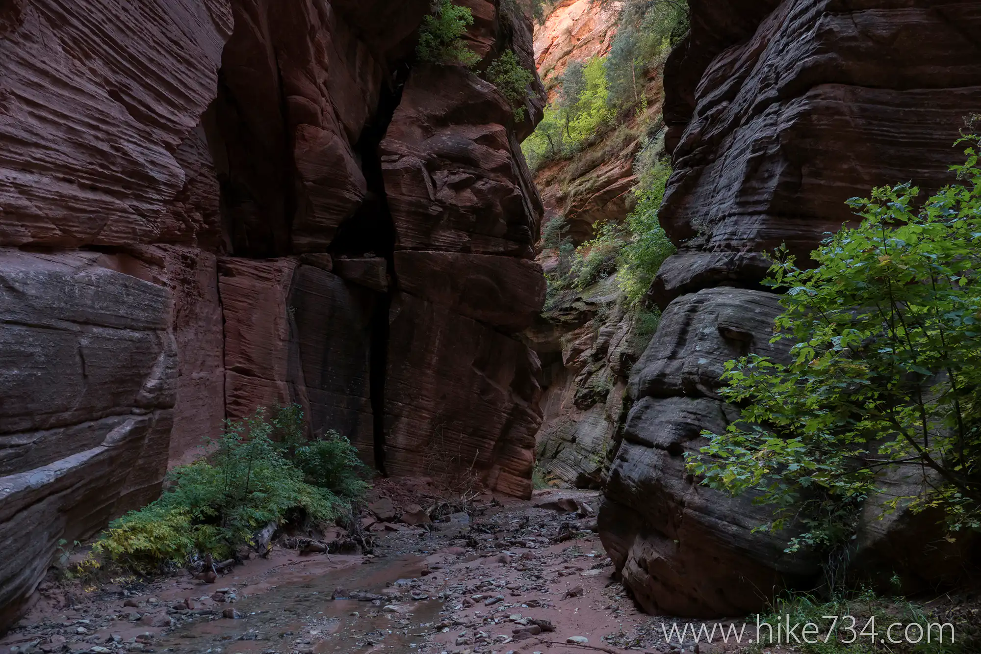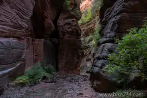 From here the La Verkin Creek Trail continues uphill to meet up with the Hop Valley Trail which offers another alternative route mentioned below. Continue on the La Verkin Creek Trail for more creek bottom goodness of shrubs, trees, plants, cool rock features, and towering rock walls.